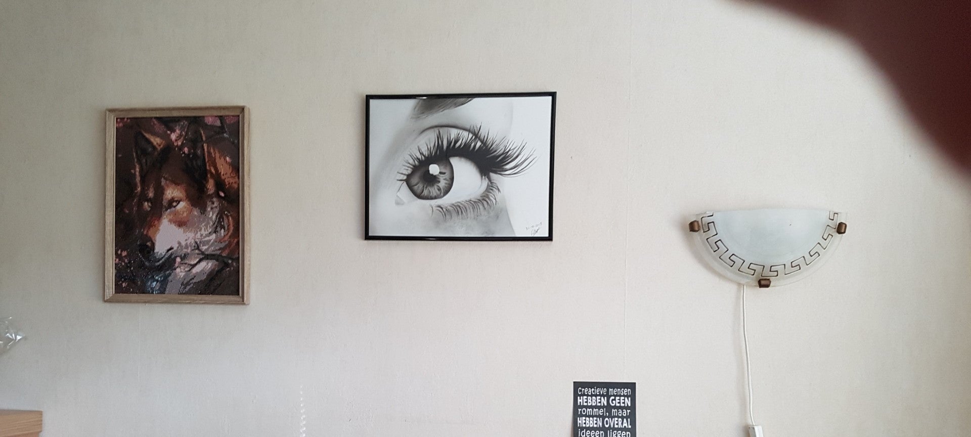 Tijdens de airbrush is een oog gemaakt. Deze is gemaakt in zwart/wit. Met hulp van een voorbeeld en stencil zijn de vormgeving en structuren aangebracht. De ondergrond is Yupo papier 35 x 50 cm. De gebruikte verf is Createx Illustrations Black verdund met Createx Illustrations Transparant en Createx Reducer. Voor het gummen van highlight is gebruikt gemaakt van een Faber-Castell Perfection 7057 gumpotlood